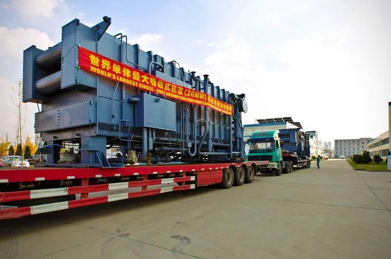 烟台荏原生产的8台超大型溴化锂吸收式热泵机组已于日前陆续出厂,供京能热电使用。此次供货的热泵机组单机制热能力达到20MW,是迄今为止单体最大的吸收式热泵机组。采用吸收式热泵技术可对热电厂循环水余热得到利用,总供热能力达到160MW,在不增加锅炉和供热机组的情况增加供热面积200万平米,有效解决了电厂供热能力不足的问题。