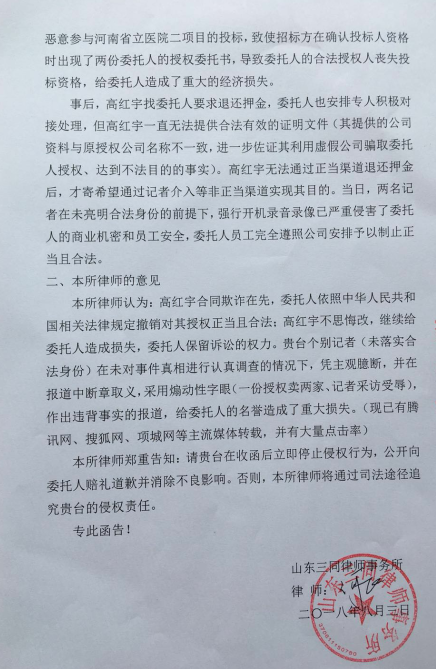 在通过合法渠道无法达到其目的时,该当事人高某便邀约个别“记者”到我司担当事务所无理取闹,并编排所谓“新闻”,企图通过“舆论暴力”实现其不法目的。某电视台在未经全面了解事实真相、认真审核“新闻”稿件的情况下在网上进行了发布。对此,我司及时予以应对,已向编发此“新闻”的电视台、当事人高某及其所在公司寄送了《律师函》,要求对方全面了解事实真相、立即停止侵权行为、进行公开声明及道歉、及时消除对我司的不良影响;否则,我司将通过司法途径追究相关方的侵权责任。