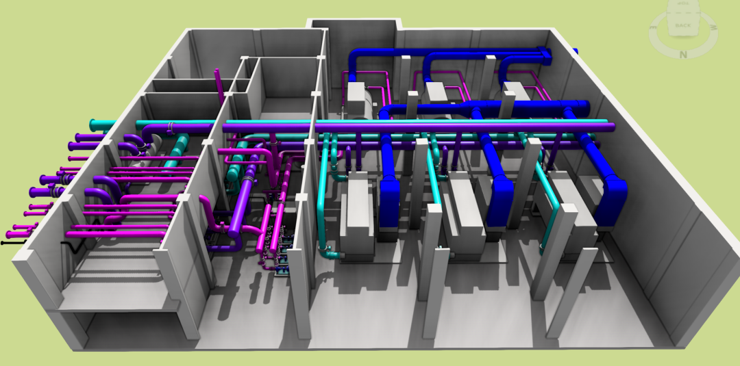 能源站上下两层总建筑面积2200㎡,站内设计空调水冷热系统、采暖水系统和卫生热水系统三大系统。采用3台荏原直燃型溴化锂吸收式冷温水机组和燃气锅炉作为冷热源主体,配置30mg/m?超低氮型燃烧器,配合系统工程上精确的低温高空排放措施,使得排放物满足北京市DB11-2017《大气污染物排放标准》。