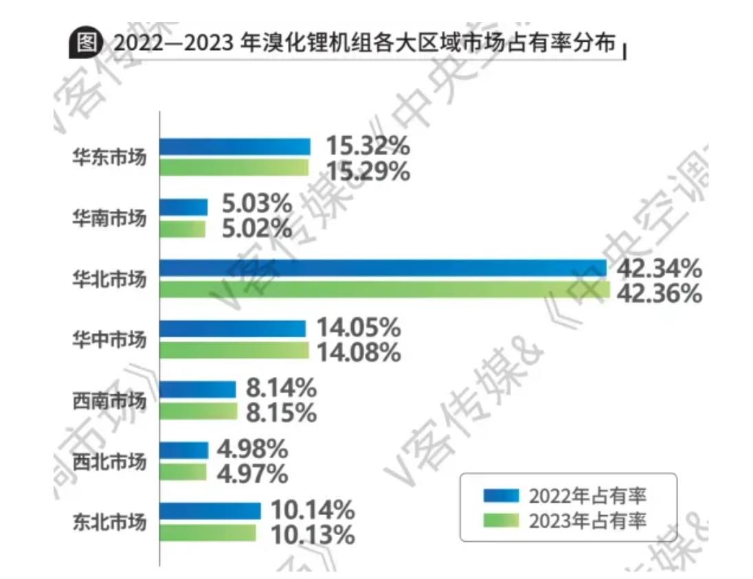区域层面,华北、华东地区作为我国以石油和化工为主导的工业园区的主要分布地,也是余热废热利用的重点区域,溴化锂机组一直保持着较高的市场占有率。其后市场占有率从高到低依次为华中、东北、西南、华南以及西北地区。其中,随着能源开发工作的持续推进,溴化锂机组在西南区域的应用逐渐增多,市场占有率达8.15%。